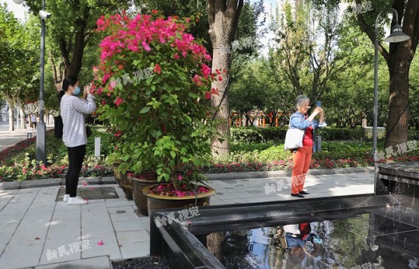 图说:围墙打开后,公园外途经的市民可以欣赏园内的美景。新民晚报记者 周馨 摄